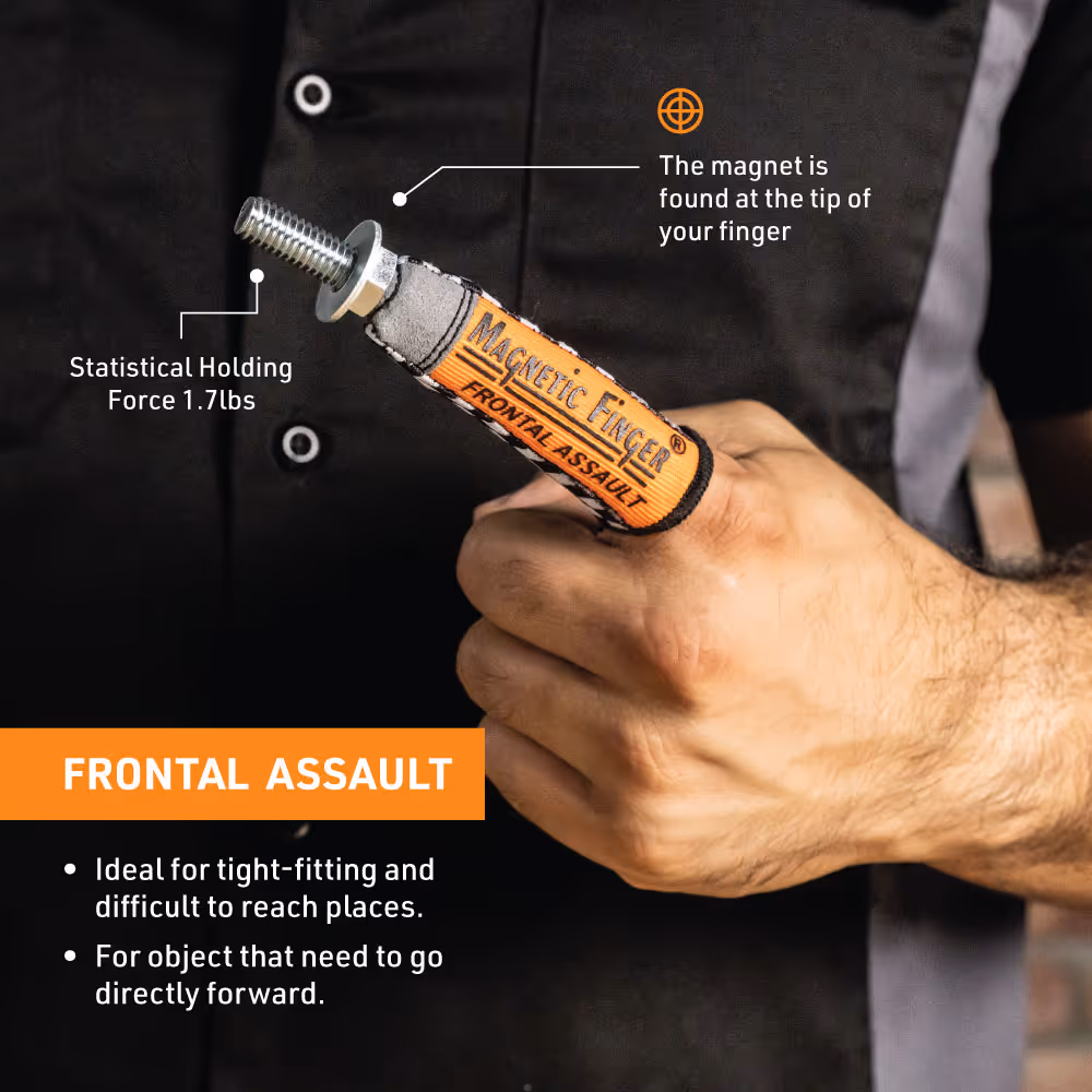 The Frontal Assault is a variation of the original Magnetic Finger, with the magnet placed at the fingertip for precise forward placement in tight, hard-to-reach spots. Perfect when direct, straight-ahead access is needed.