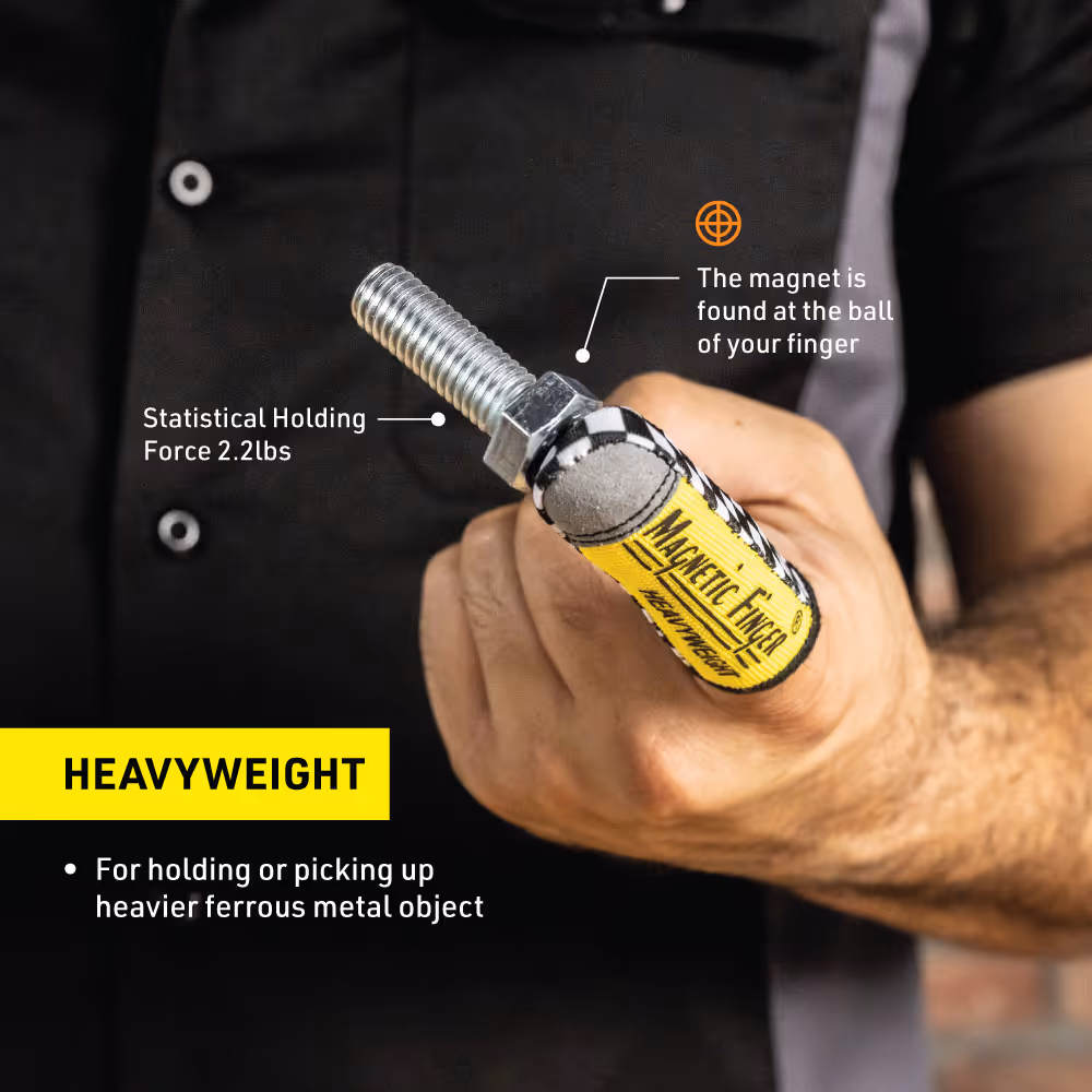 The Heavyweight Magnetic Finger is built for larger, heavier metal objects like cylinder head bolts and lug nuts—ideal for diesel and tractor mechanics. It combines the Original’s design with a stronger magnet and the Industrial Finger’s end cap to prevent glove shift under heavy loads, ensuring precise control and reliable grip.