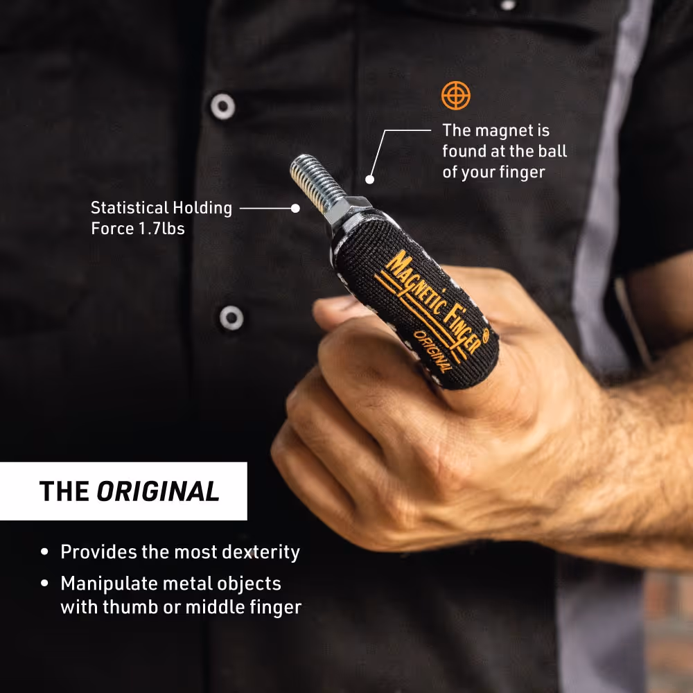 The Original Magnetic Finger features a tip-mounted magnet for precise control and easy retrieval of small metal objects—perfect for tight spaces. Its placement allows maximum dexterity for thumb-and-finger manipulation.